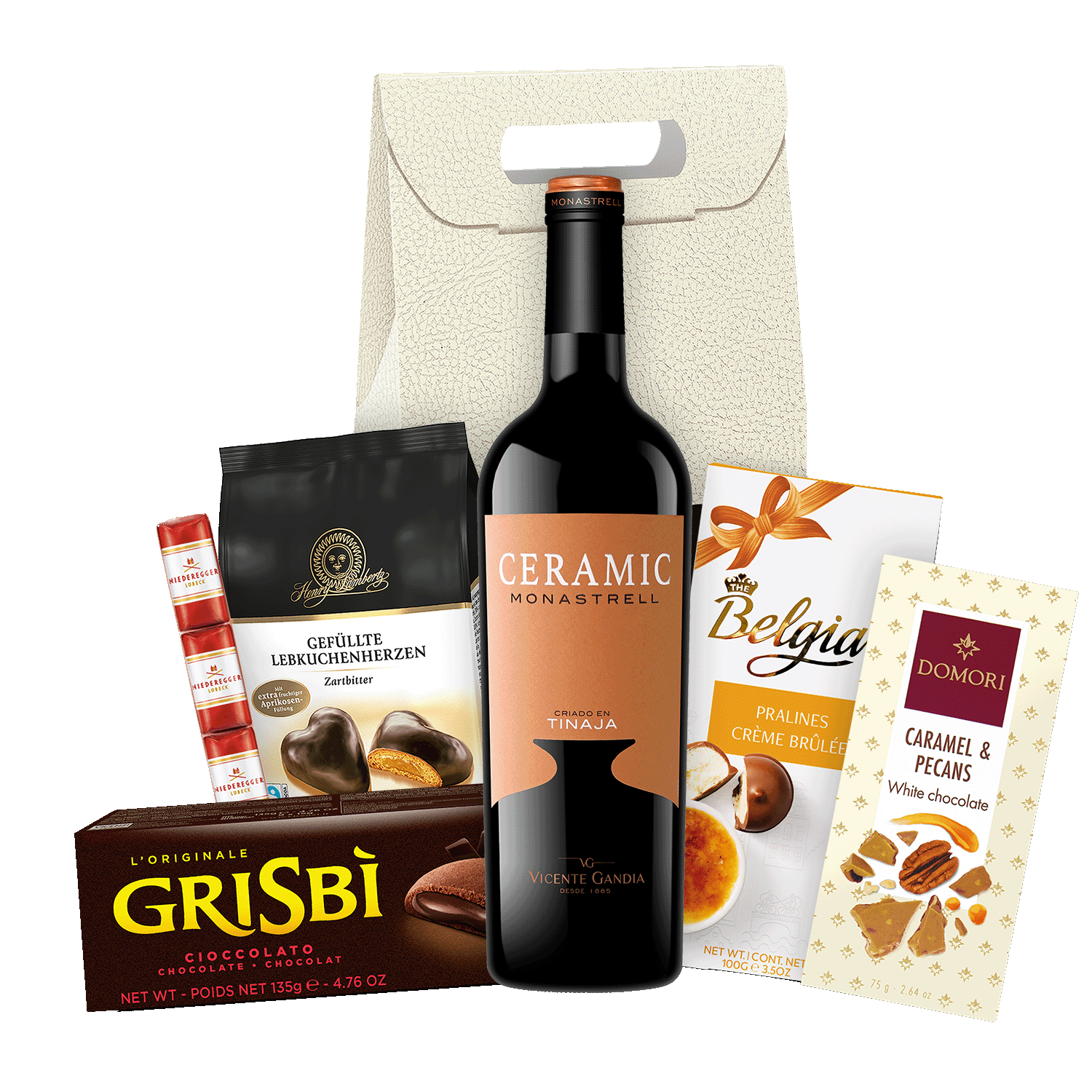 Pachetul Amber are o personalitate distinctă: turtă dulce Henry Lambertz cu caise în ciocolată, fursecuri Grisbi, praline belgiene Crème Brûlée, ciocolată albă Domori Caramel & Pecan, praline de marțipan Niederegger și un vin roșu spaniol Vicente Gandia Ceramic Monastrell 750ml. Ambalat elegant în cutie 18×9×38.5 cm.