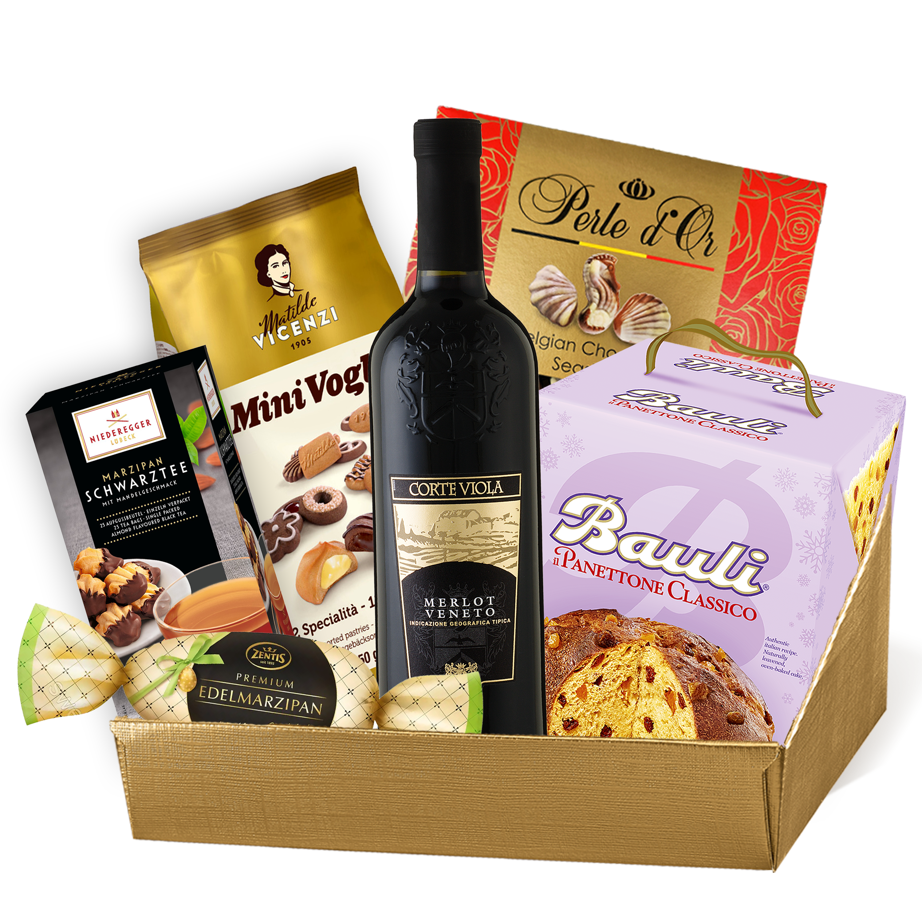 Bauli Panettone + Perle D'Or praline + Niederegger ceai + Corte Viola Merlot 750ml