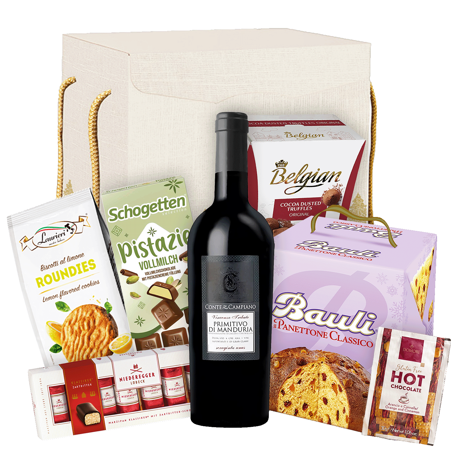 Bauli Panettone + Schogetten Fistic + Niederegger Marzipan + Primitivo Manduria 750ml