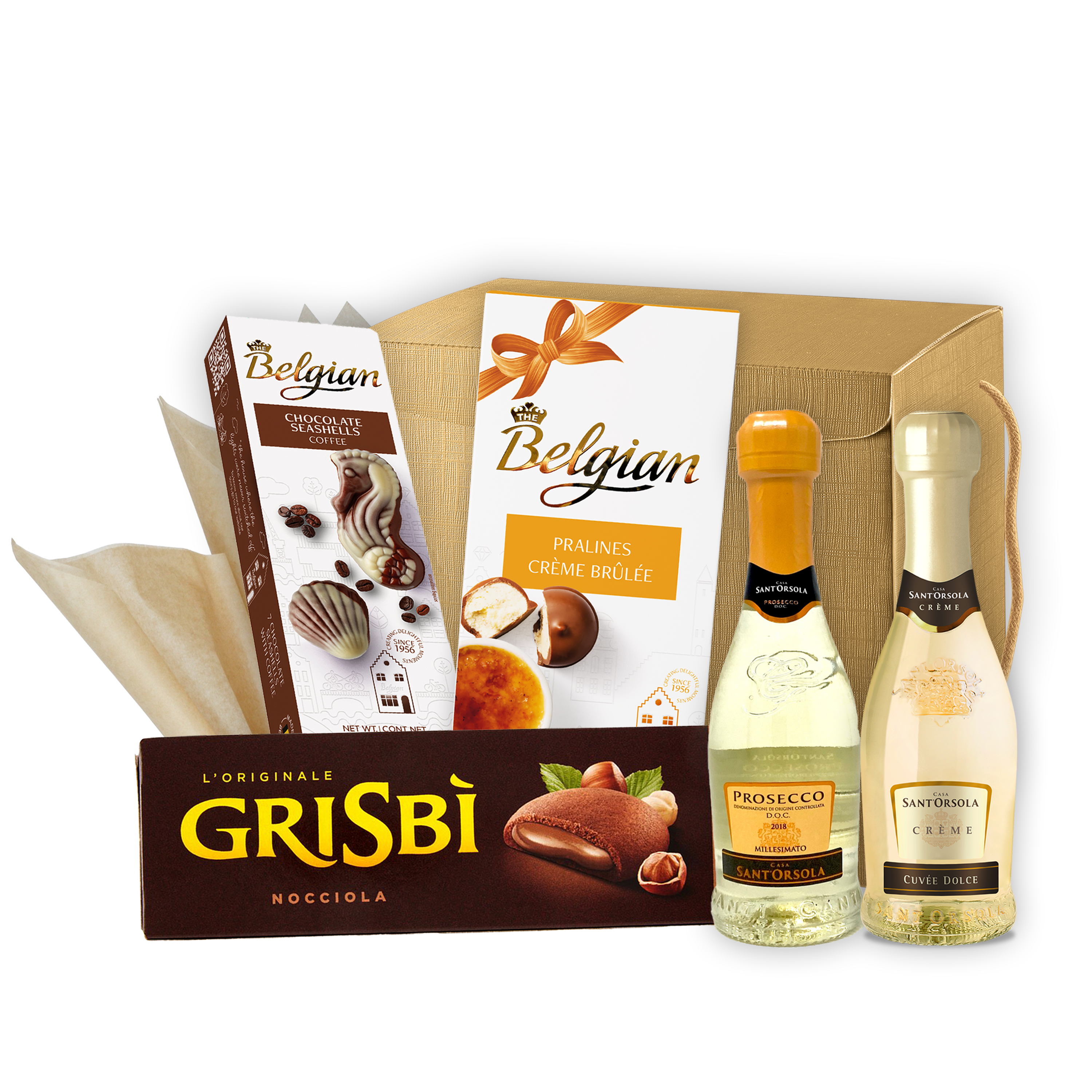 Praline belgiene + Grisbi alune + 2× Santorsola spumant 200ml · Cutie tematică