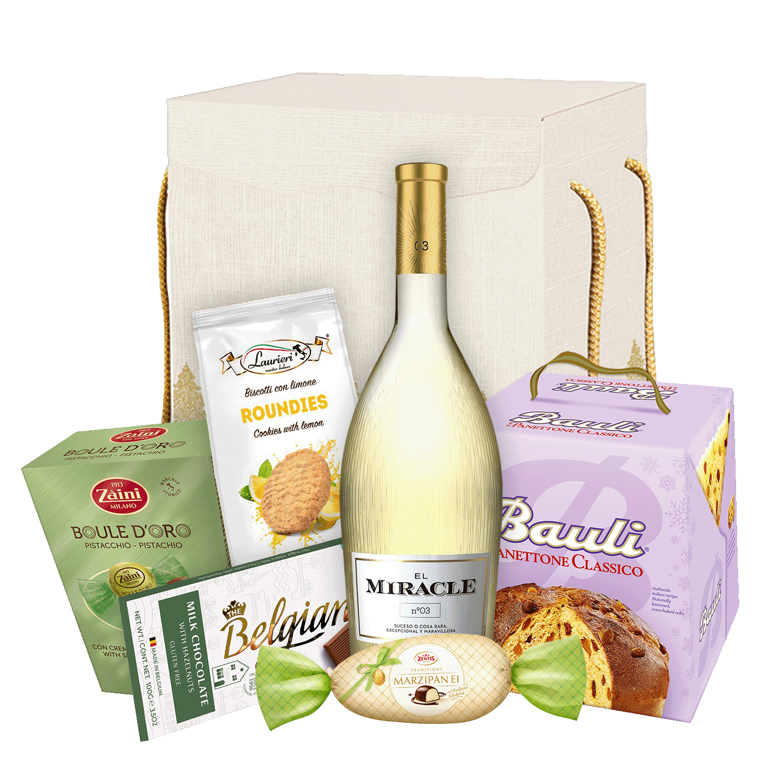 Pachetul Miracle reunește aromele primăverii: panettone Bauli, biscuiți Laurieri Roundies cu lămâie, praline Zaini Boule d'Or cu lapte și fistic, ciocolată The Belgian fără zahăr, ou de marțipan Zentis în ciocolată amăruie și un vin alb Vicente Gandia El Miracle No3 750ml. O surpriză desăvârșită.