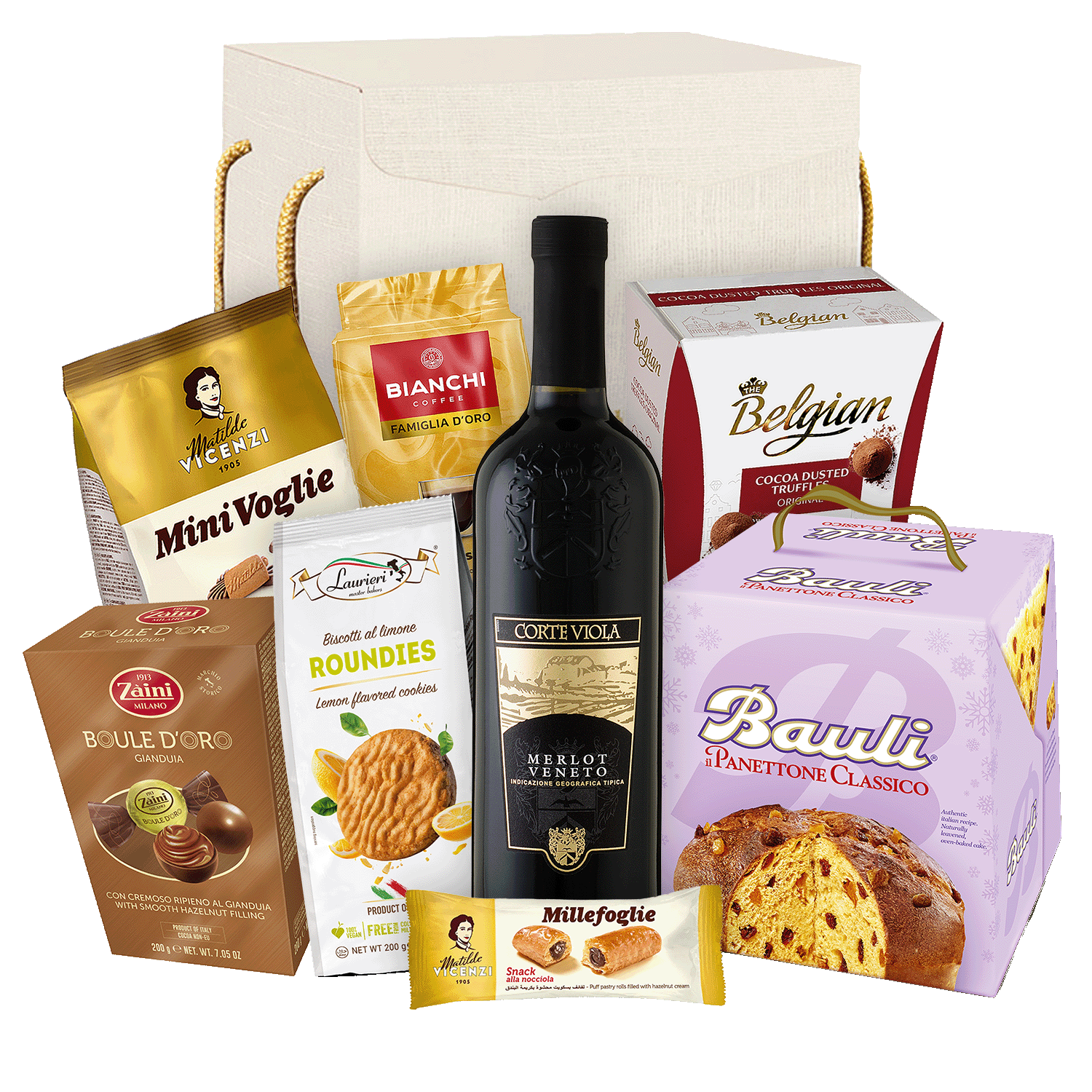 Bauli Panettone + Zaini Gianduia + Bianchi cafea + Corte Viola Merlot 750ml