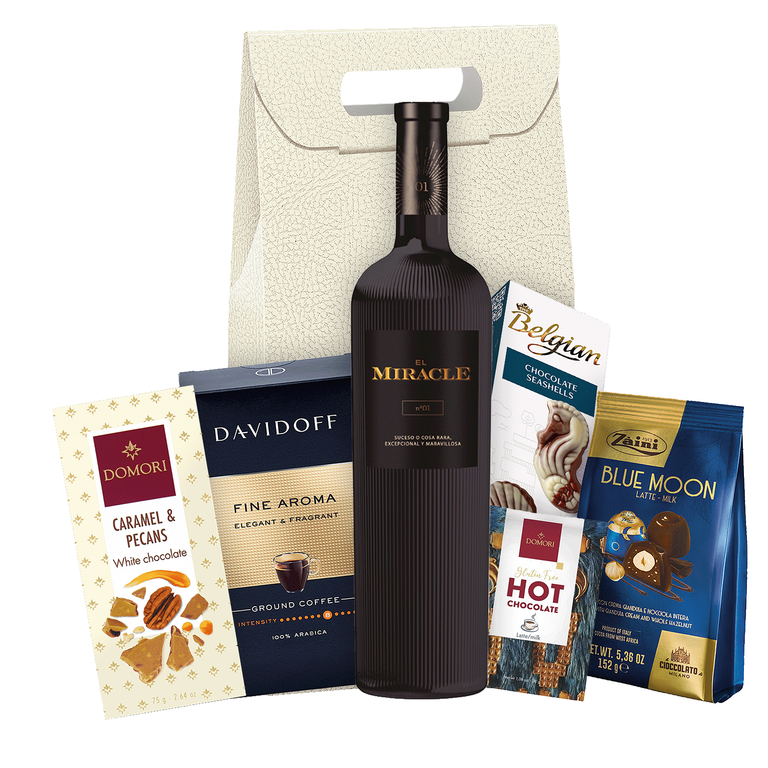 Pachetul Reina este creat pentru cei care iubesc cafeaua și ciocolata fină: praline Zaini Blue Moon cu lapte și alune, ciocolată Domori Caramel & Pecan, praline belgiene fructe de mare, ciocolată caldă Domori cu lapte, cafea măcinată Davidoff Fine Aroma și un vin roșu Vicente Gandia El Miracle No1 750ml.
