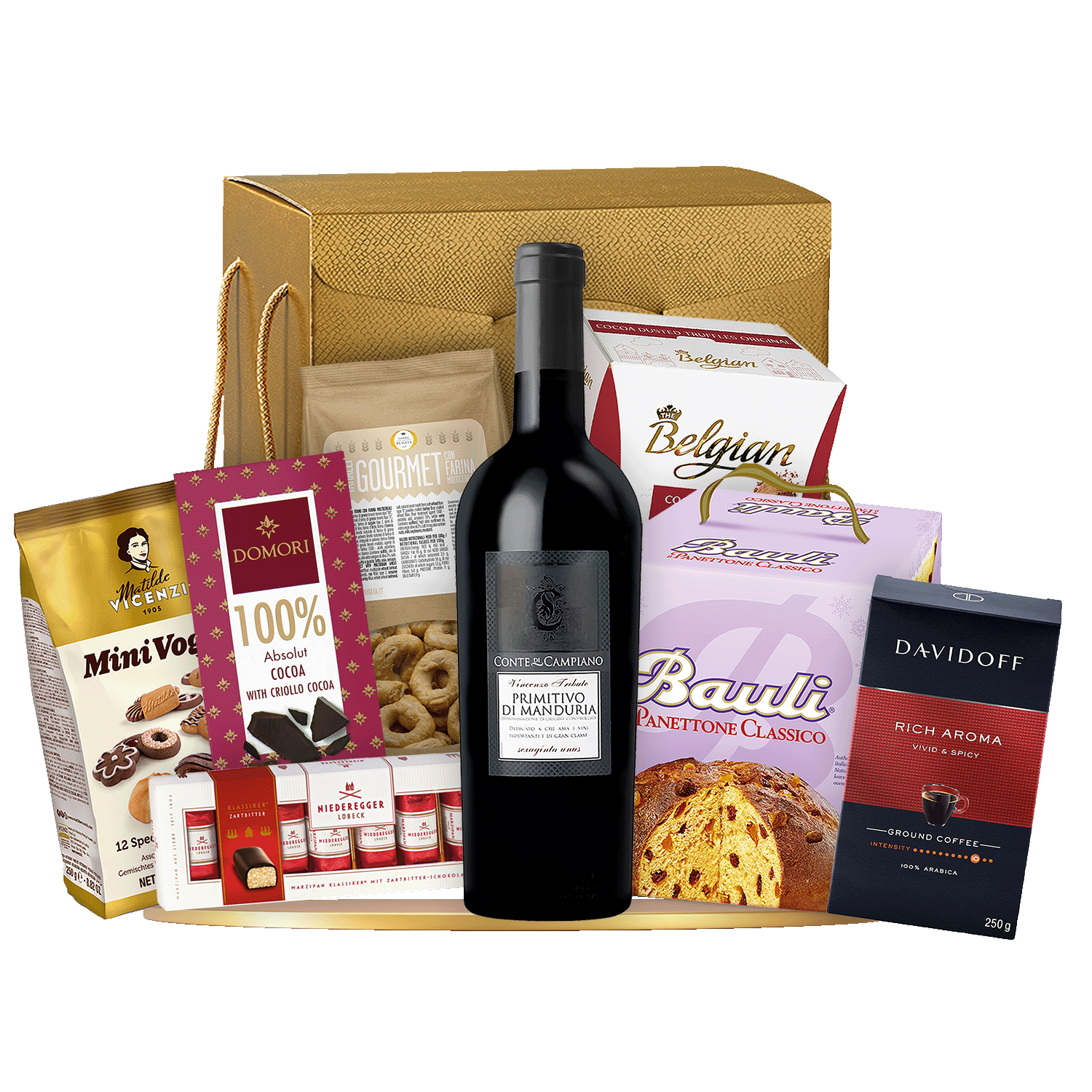Domori 100% Criollo + Davidoff Rich Aroma + Bauli Panettone + Primitivo Manduria 750ml